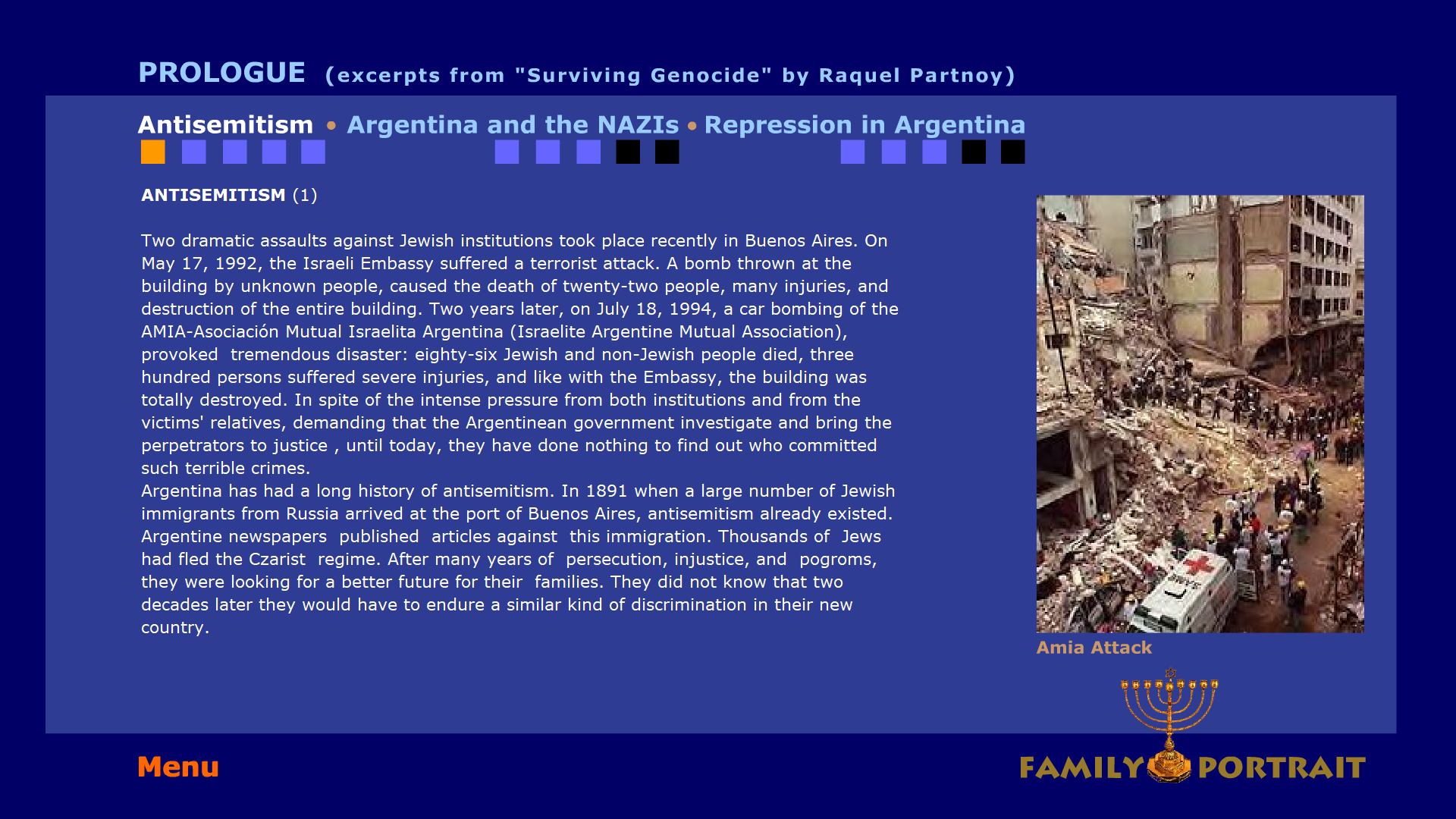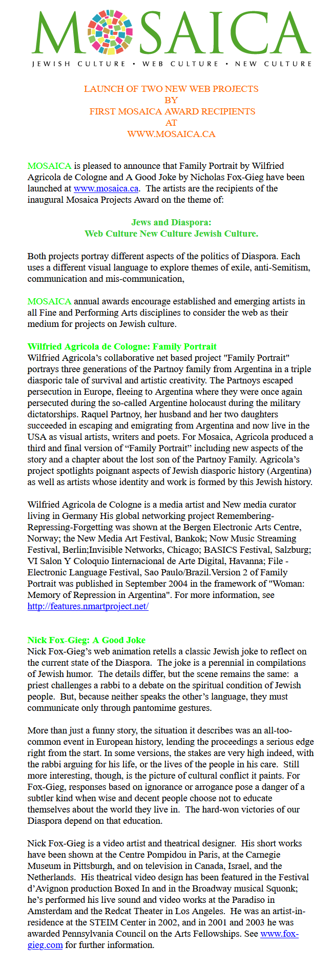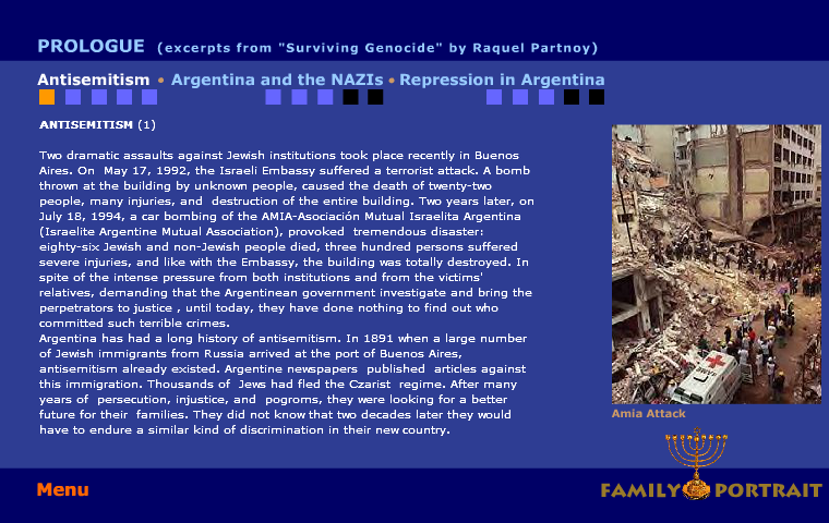 In the framework of MOSAIC AWARD 2005, Agricola produced a third and final version of “Family Portrait” including new aspects of the story and a chapter about the lost son of the Partnoy Family. Agricola’s project spotlights poignant aspects of Jewish diasporic history (Argentina) as well as artists whose identity and work is formed by this Jewish history.