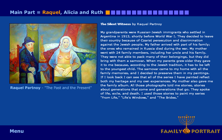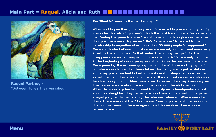Although I never met any member of Partnoy family personally, due to the most intensive and trustful contatcs to Raquel since 2001, it is just like I am a close friend to the family and I would know all of them since long time. When I came in touch with Raquel, I felt immediately touched by her visual and literary art work. It took not long time until the idea of the “Family Portrait” was born, but nobody would have ever expected a collaboration lasting for so many years. Especially Version III gives evidence how intimate the relation especially to Raquel had grown, as she opened an otherwise closed chapter of her life, her only son Daniel, who committed suicide. This trust makes me feel very proud!