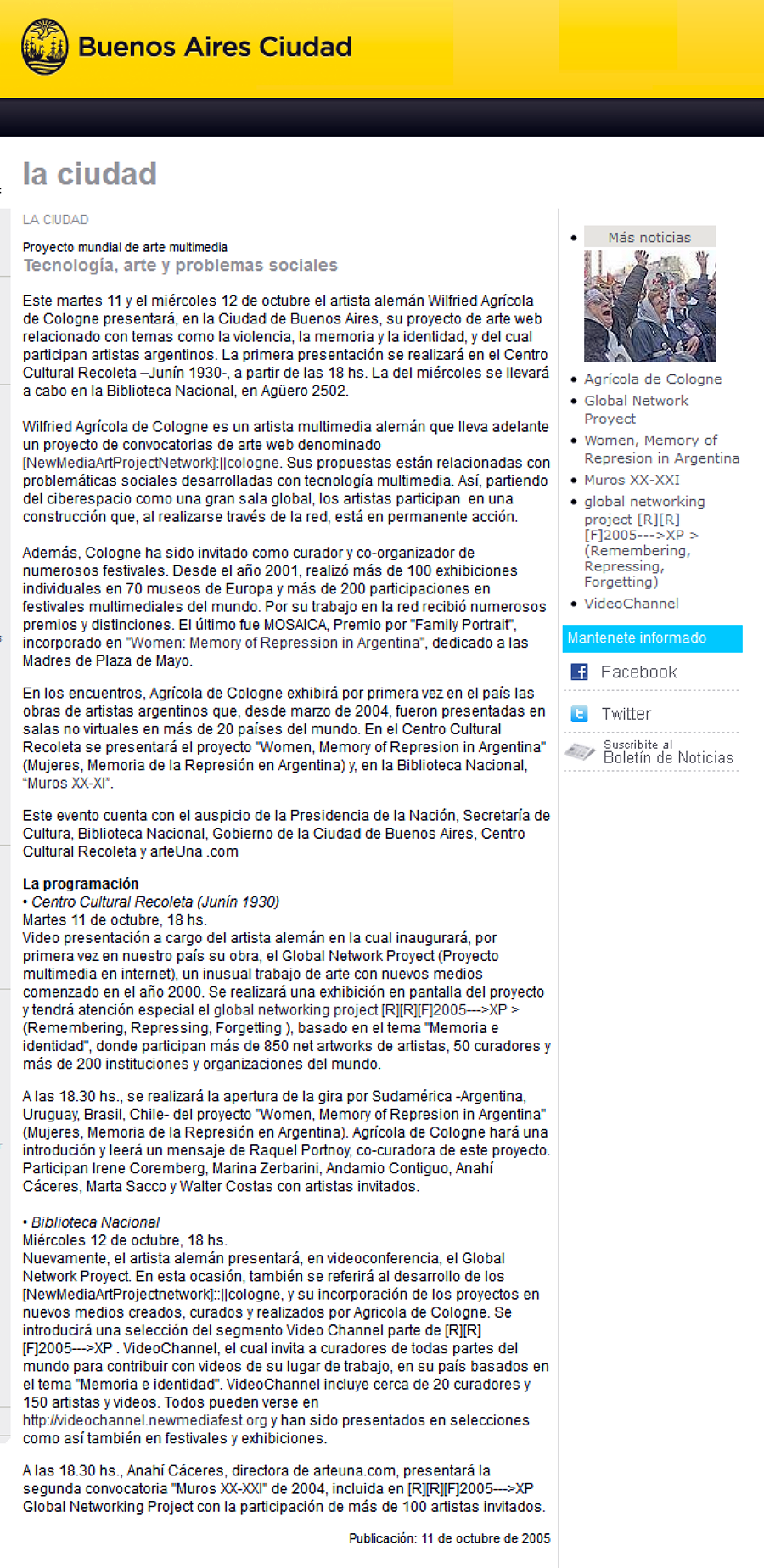 Anahi catched him in Buenos Aires at a bus stop, taking him to his hotel, and – this was really a surprise – in Buenos Aires the Recoleta Cultural Centre is running a hotel for artists on the ground of the cultural center. It was simply incredible to be part of a kind art installation, because this hotel is such a wonderful place, and the venue for the 1st project presentation is Recoleta, this evening, 11 October 2005, tomorrow, 12 October Anahi arranged a 2nd presentation at The National Bibliotheque, but this evening has a particular relevance, hardly to believe but Wilfried will meet not only the other participants in the project, besides Raquel who is residing in Washington DC in USA, but representatives of the Mother pof Plaza de Mayo organisation will be attending, and these will be the most touching moments of the entire journey.