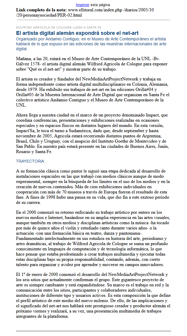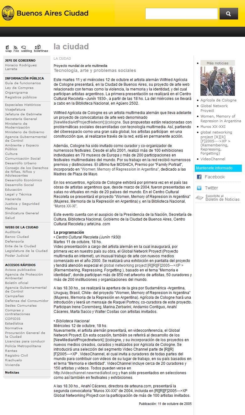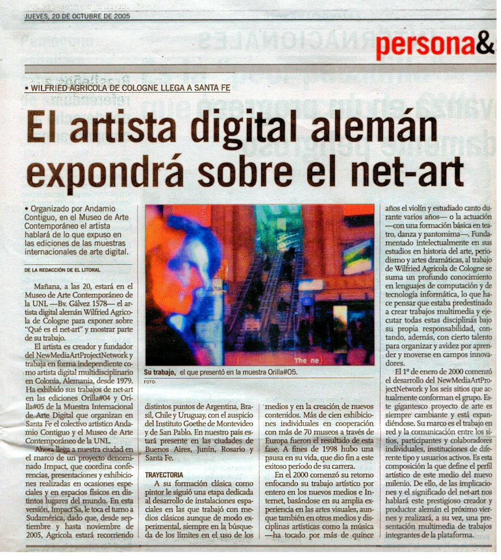 Este martes 11 y el miércoles 12 de octubre el artista alemán Wilfried Agrícola de Cologne presentará, en la Ciudad de Buenos Aires, su proyecto de arte web relacionado con temas como la violencia, la memoria y la identidad, y del cual participan artistas argentinos. La primera presentación se realizará en el Centro Cultural Recoleta –Junín 1930-, a partir de las 18 hs. La del miércoles se llevará a cabo en la Biblioteca Nacional, en Agüero 2502.
